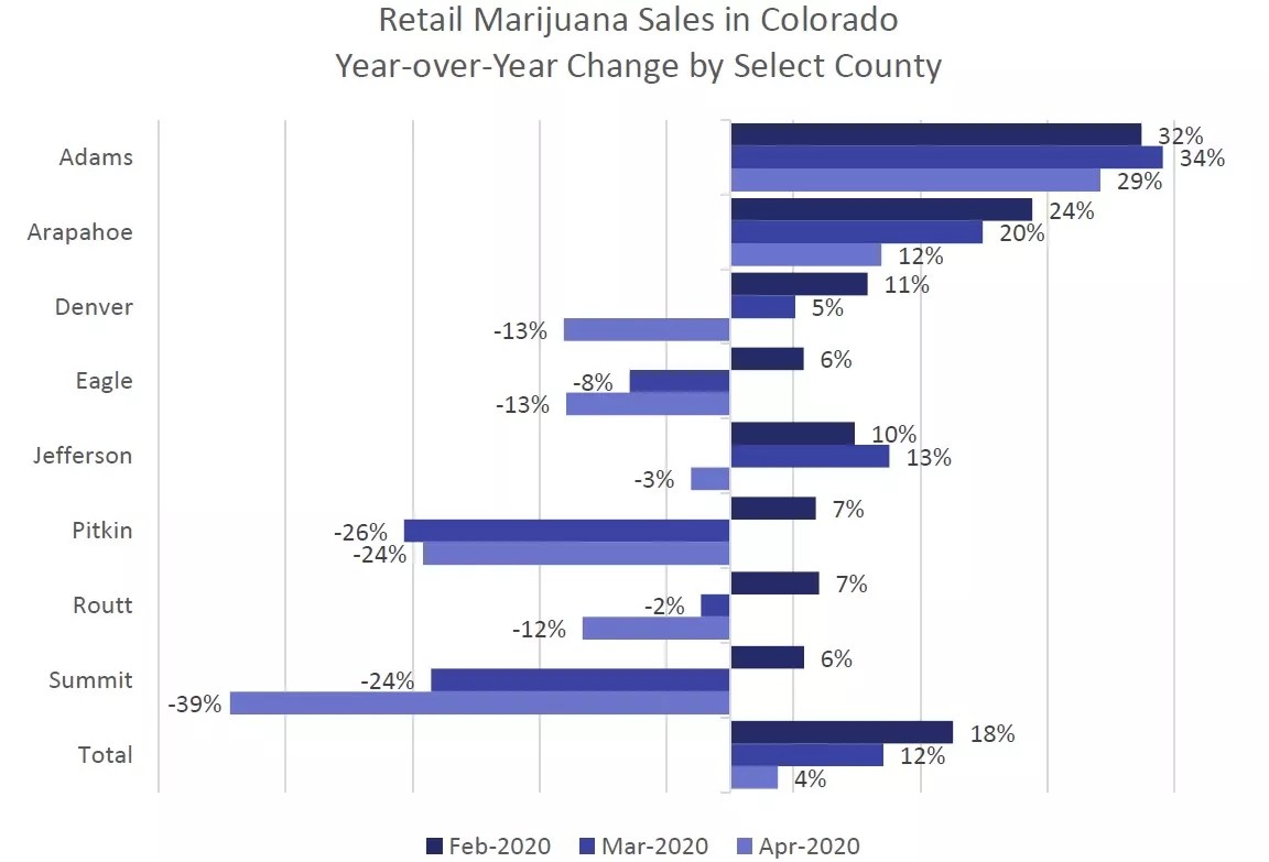 Other economic indicators are more varied, including those touching upon the marijuana industry. As you can see in this chart, retail sales in counties that rely on tourism fell sharply in March and April – but the percentages were actually up in most of the Denver metro area.
