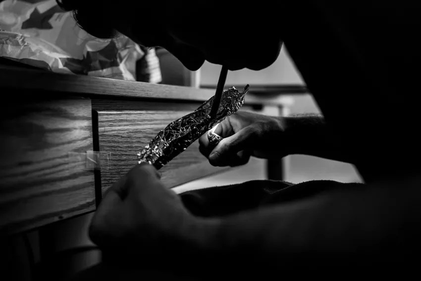 Toward the end of the school year, Demetri sat in his dorm room, adding a piece of burnt foil to the pile on his desk. He had grown his collection after months of daily heroin smoking.