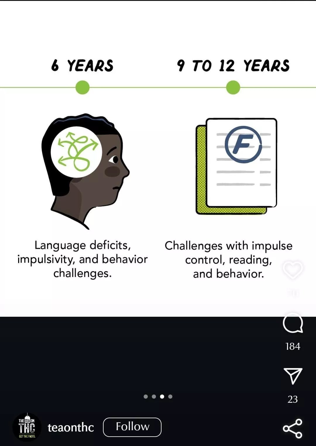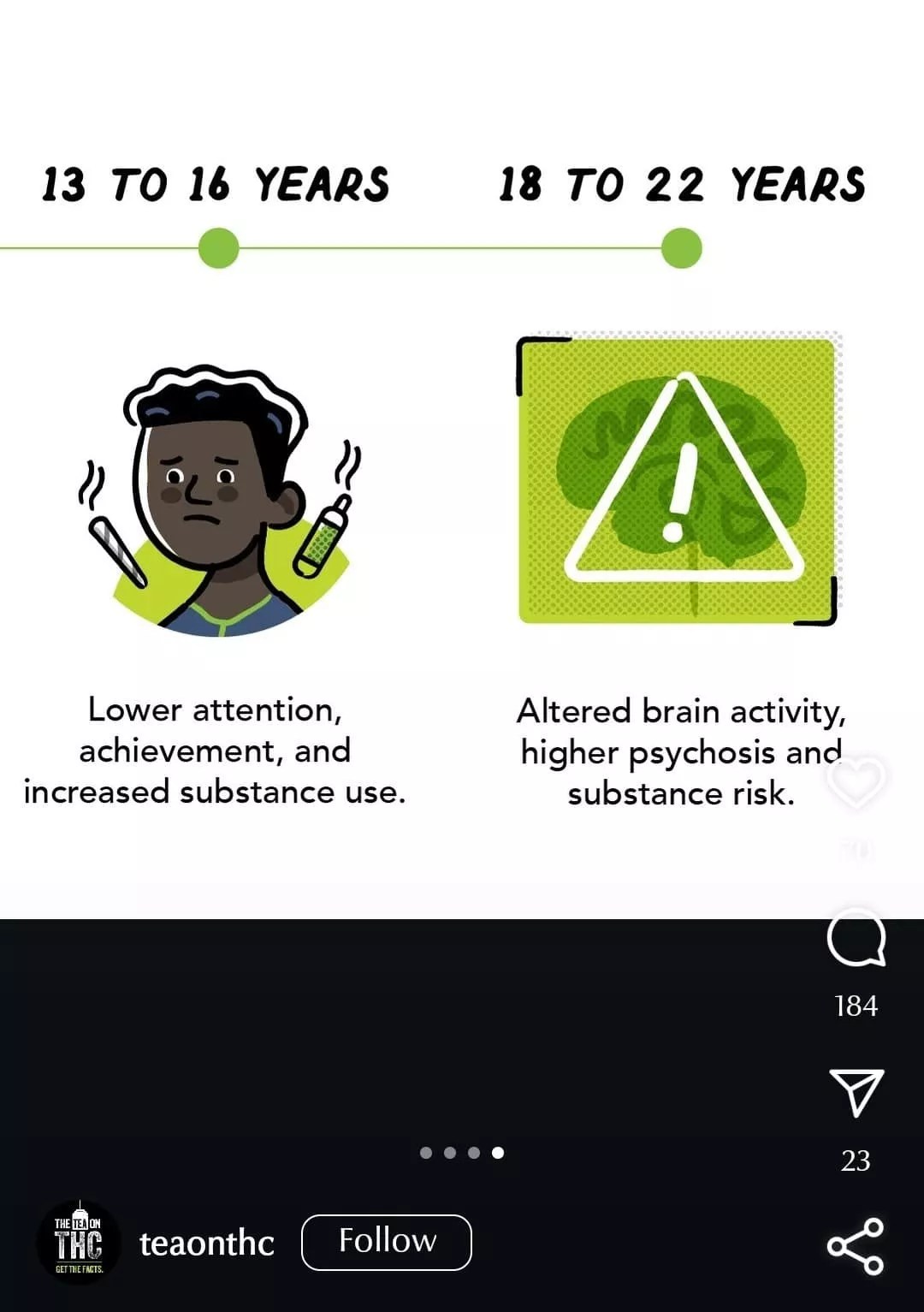 The graphics mention risks to an unborn child when a mother smokes, vapes or eats marijuana, including issues such as “impaired mental development,” “lower scores in verbal reasoning and memory,” “increased substance use,” “altered brain activity, higher psychosis and substance risk” and “challenges with impulse control, reading and behavior.” At one point, the photos featuring Black characters were included in a now-deleted photo slideshow on the Tea on THC’s social media pages.