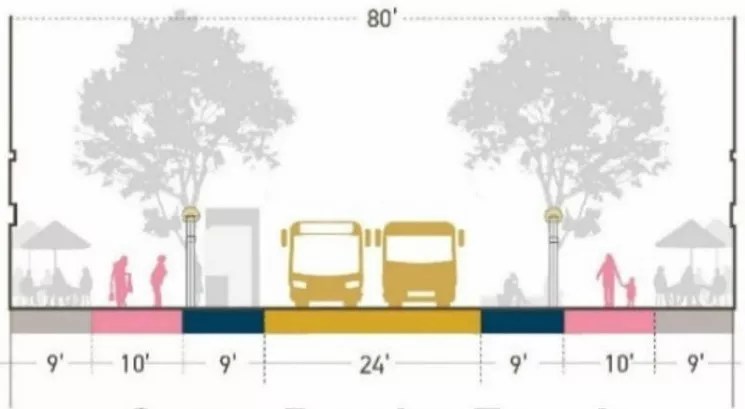 The plan calls for the elimination of the median and larger areas on either side of the street.