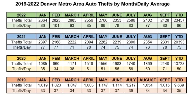 Another chart focuses in on metro Denver. The car theft totals for January through September were calculated at 9,639 and 13,723 in 2019 and 2020, respectively. But they rose to 20,393 in 2021 – and in 2022, the nine-month pace exceeded last year’s by more than 3,000.