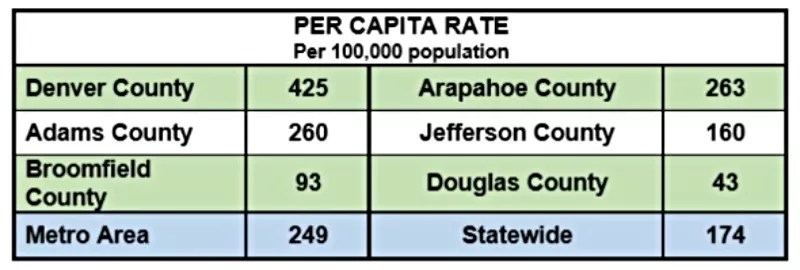 The per capita average of car thefts in metro Denver is 249 per 100,000 residents. But Denver County’s rate is much higher – 425 per 100,000. Arapahoe County (at 263) and Adams County (at 260) surpass the average, while Douglas and Broomfield counties fall below.
