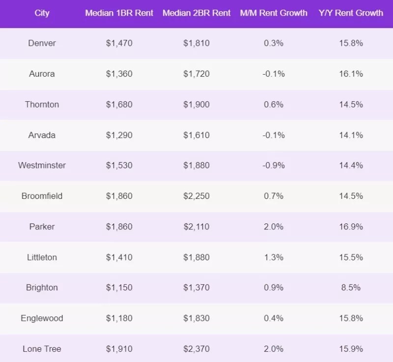 Denver’s 0.3 percent monthly increase was outpaced by Englewood (0.4 percent), Thornton (0.6 percent), Broomfield (0.7 percent), Brighton (0.9 percent) and Littleton (1.3 percent), as well as Parker and Lone Tree, both of which saw a hefty 2.0 percent spike. The only metro areas that experienced rent declines were Aurora and Arvada, which both saw a tiny 0.1 percent drop, and Westminster, a decrease of 0.9 percent.