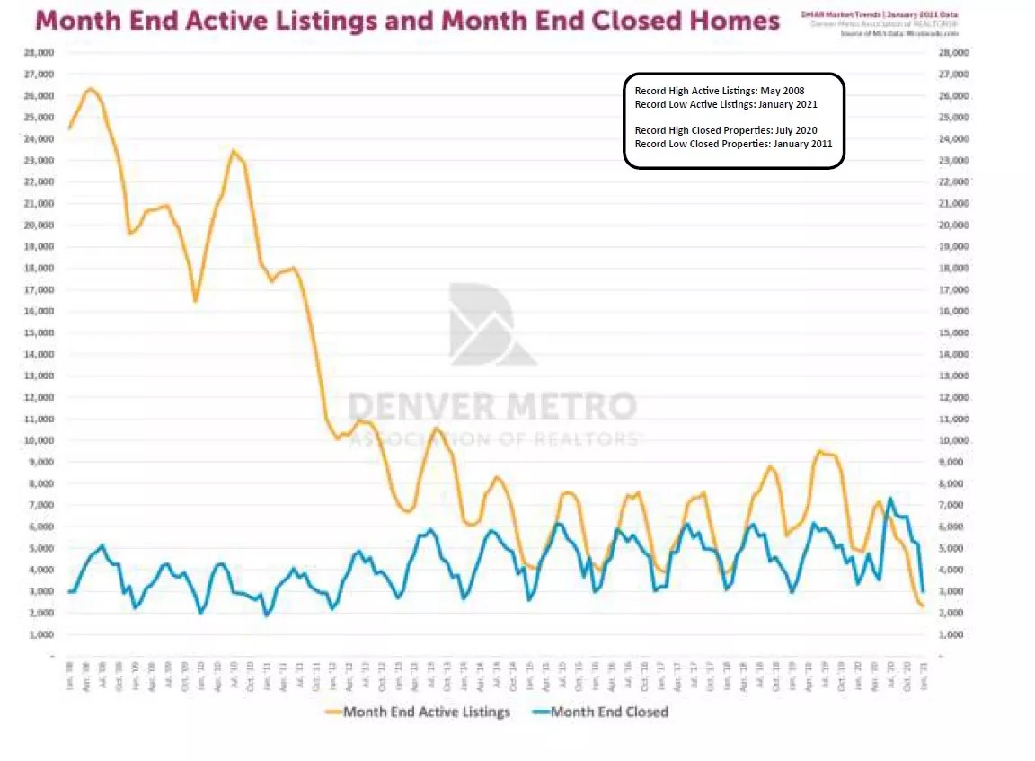 The following graphic from the report, which covers the period from 2008 to January 2021, shows just how historic these current trends are. The yellow line corresponds to active listings, while the blue line pertains to sales that closed during the respective months.