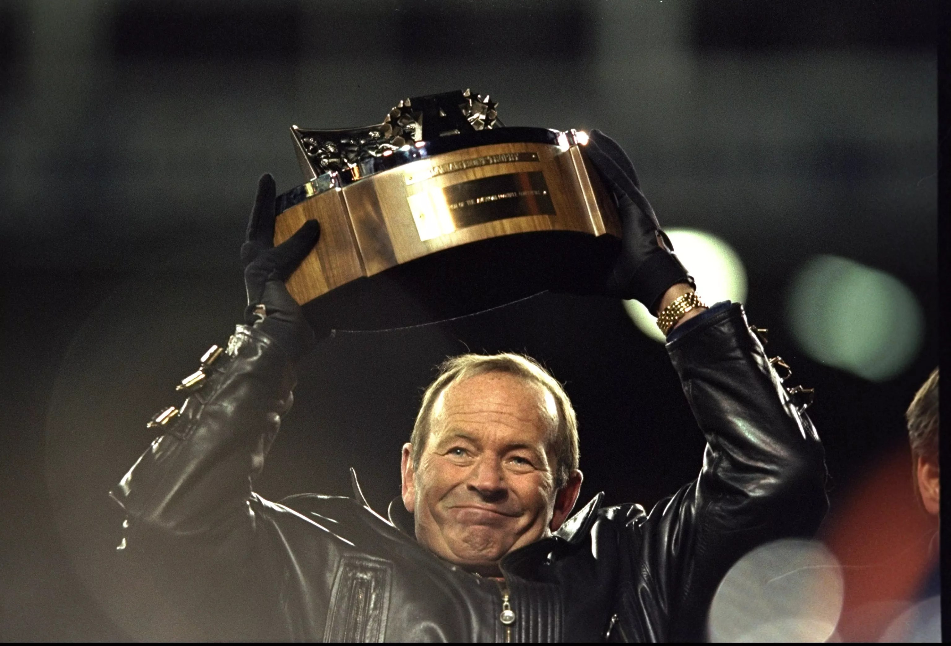 Pat Bowlen holds up the trophy after the Denver Broncos won the AFC Championship Game at Mile High Stadium in 1999.