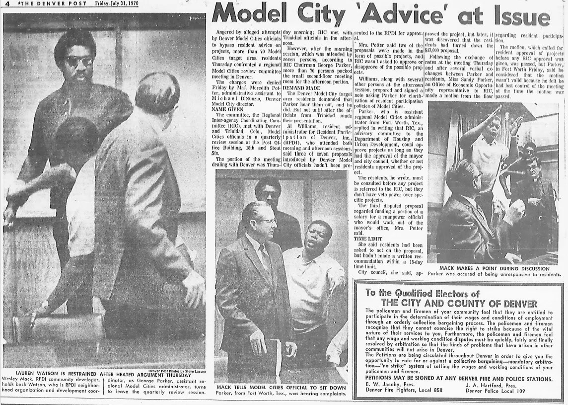 A 1970 Denver Post story about the Model City program, including a photo of Lauren Watson being “restrained.”