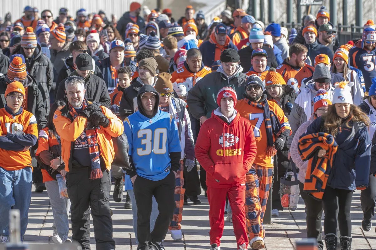 Crowds of Denver Bronco and Kansas City Chiefs fans outside Empower Field on January 5.