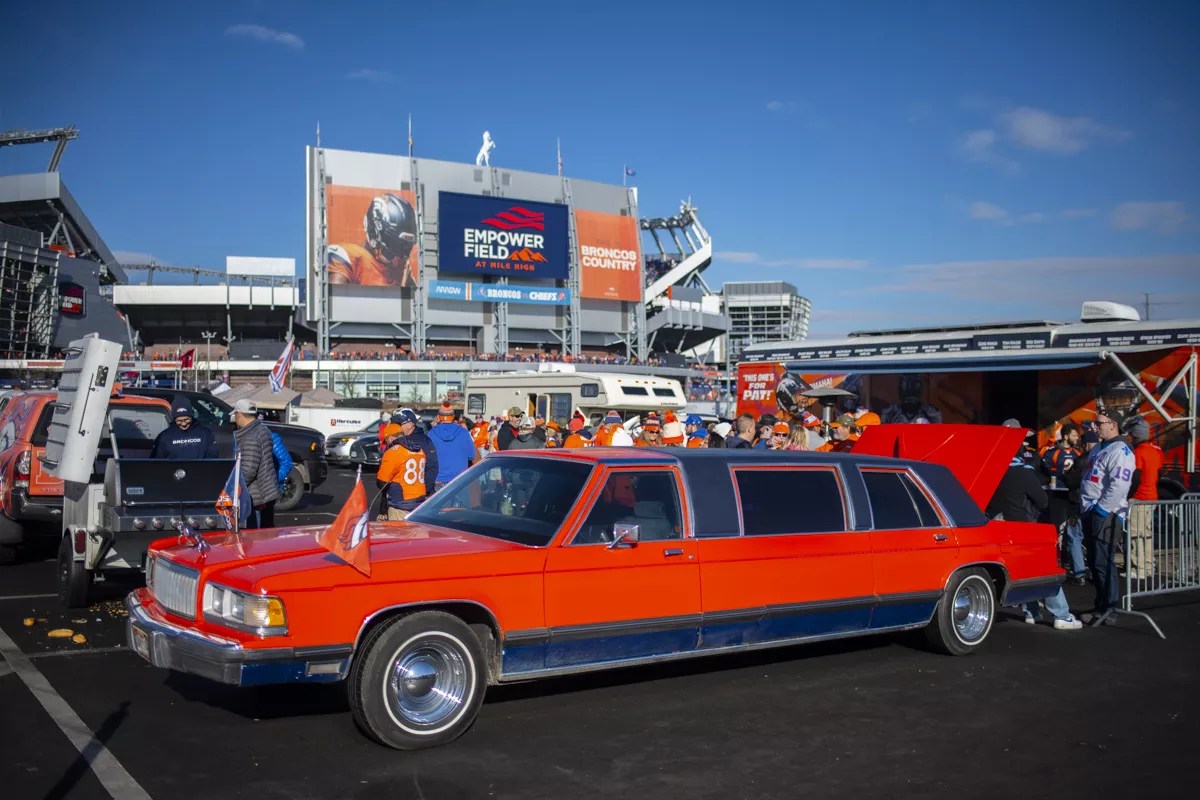 Denver Broncos fans arrive in style in their 1988 Mercury Limousine.