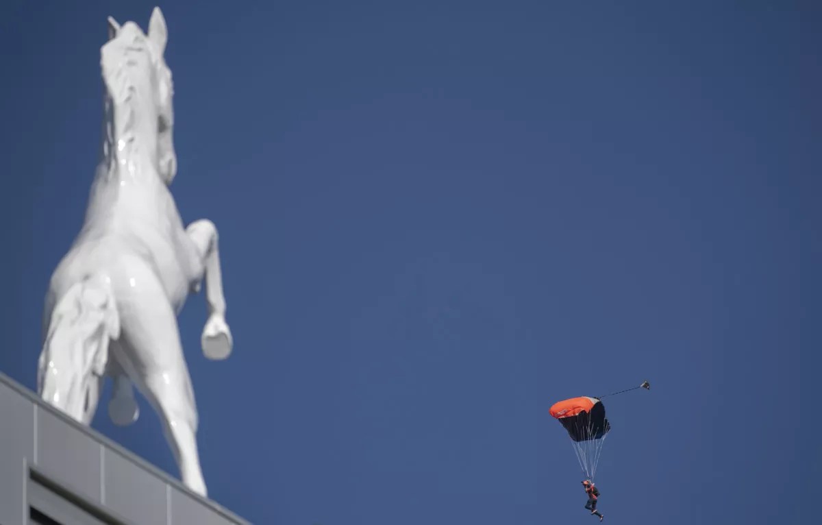The game ball arrives via parachute.