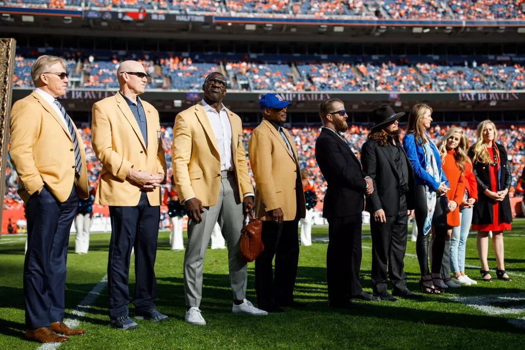 John Elway (from left) Gary Zimmerman, Shannon Sharpe, Floyd Lyttle, Patrick Bowlen Jr., John Bowlen, Beth Bowlen-Wallace, Annabel Bowlen and Brittany Bowlen during the October 13 halftime ceremony to honor Pat Bowlen, recently inducted into the Pro Football Hall of Fame.