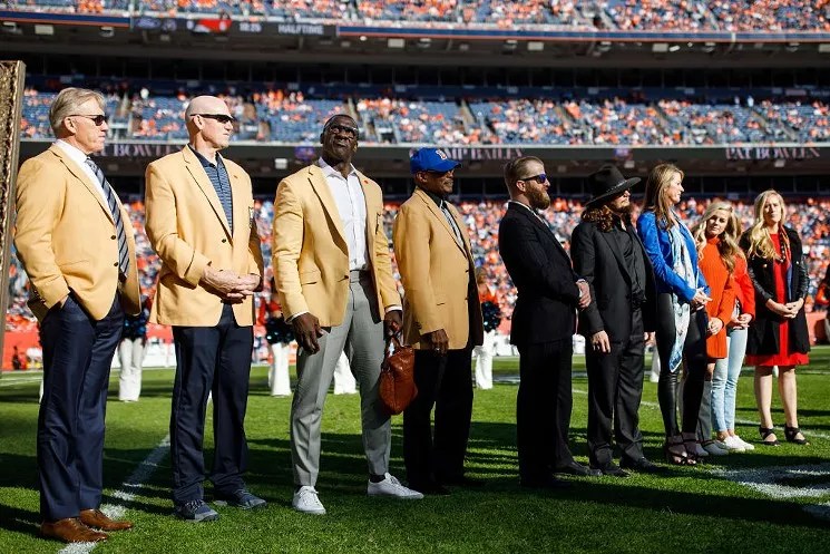 John Elway (far left) joined Patrick Bowlen Jr., John Bowlen, Beth Bowlen-Wallace, Annabel Bowlen and Brittany Bowlen (from right) during the October 13 halftime ceremony to honor Pat Bowlen.