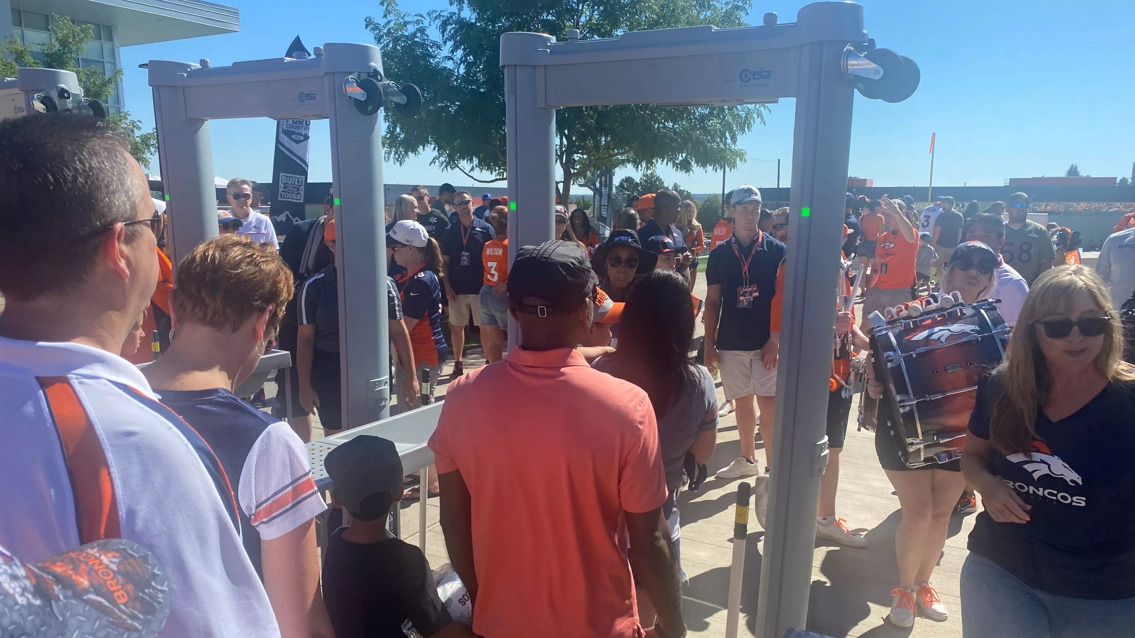 When 9 a.m. rolled around, Broncos personnel began giving people access to the hillside overlooking the practice fields, but the process was incredibly slow. Staffers didn’t require everyone to dump their belongings into a bin before they passed through the two metal detectors initially in use, instead instructing them to hold their items to their chest as they passed through. If the metal detectors went off, as they almost always did, the person was made to walk back through it again before being directed to a nearby worker who did a more thorough search.