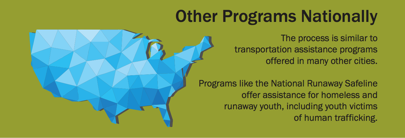 The Family Reunification Program provides qualifying applicants with one-way bus tickets out of Denver. According to an email from Smith, “it is a fairly small program with annual expenditures of about $30k or less and serves around 130 people/families.”