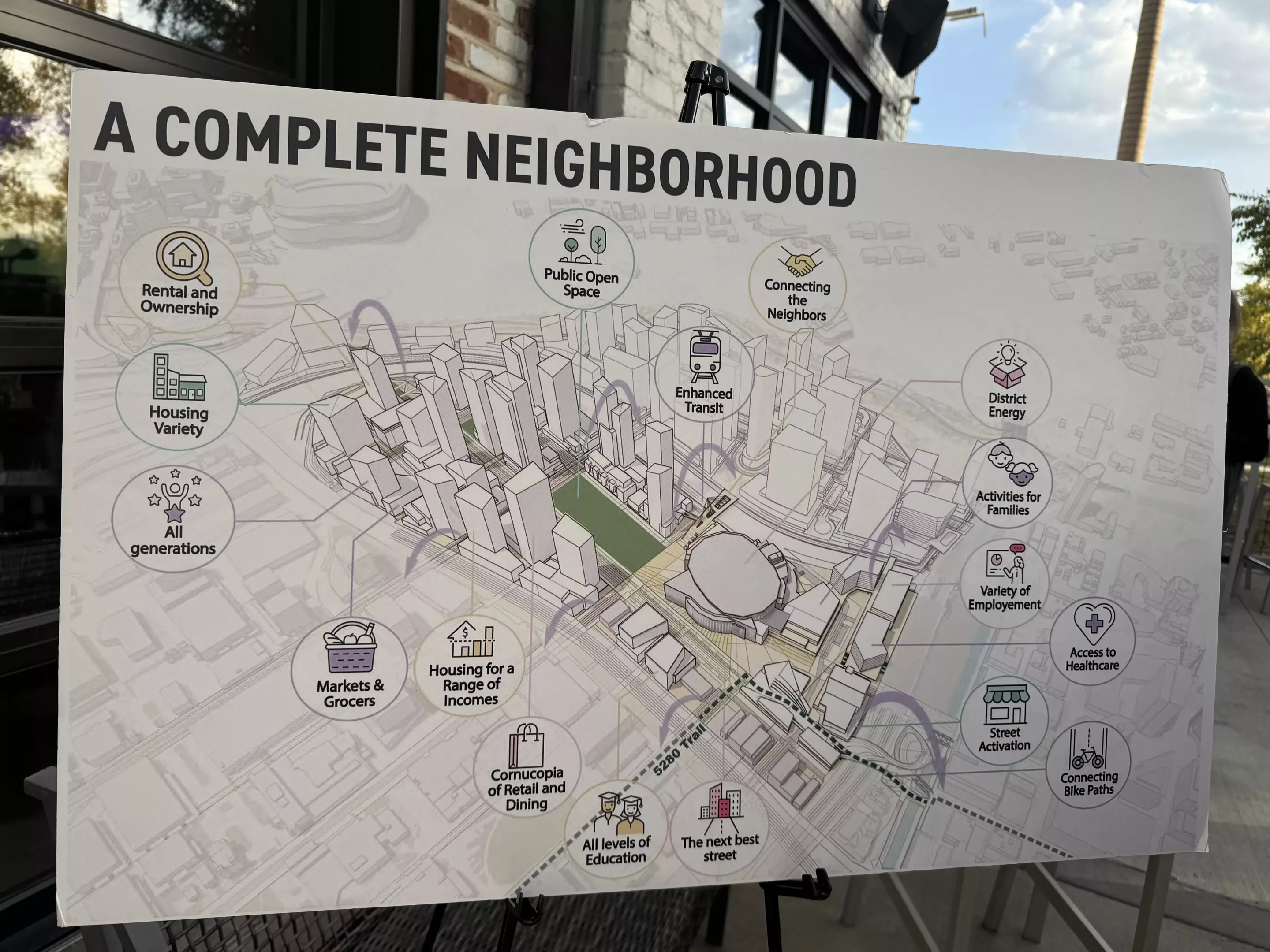 For example, the development document includes a special agreement with the Denver Department of Housing Stability requiring that 18 percent of the units across the site be affordable, with some units integrated into mixed-income buildings and others in all-affordable buildings. Affordable housing will be included during every phase of construction and spread across the geographical area of the development.