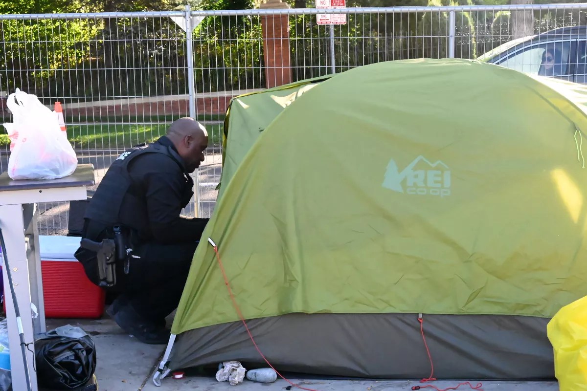 A Denver police officer tells a homeless man that he has to move his tent out of an encampment in Capitol Hill.