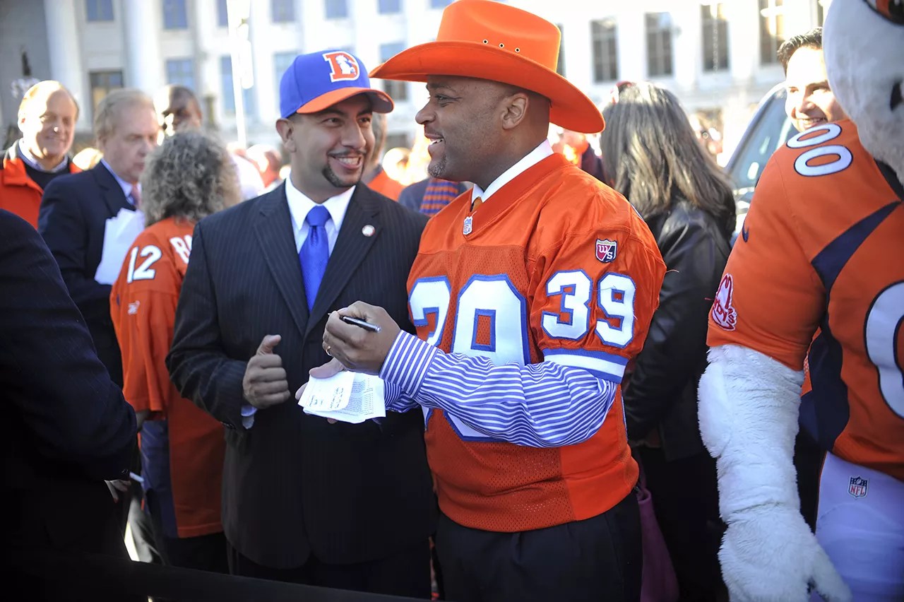 Paul López with fellow Broncos fan Mayor Michael Hancock.