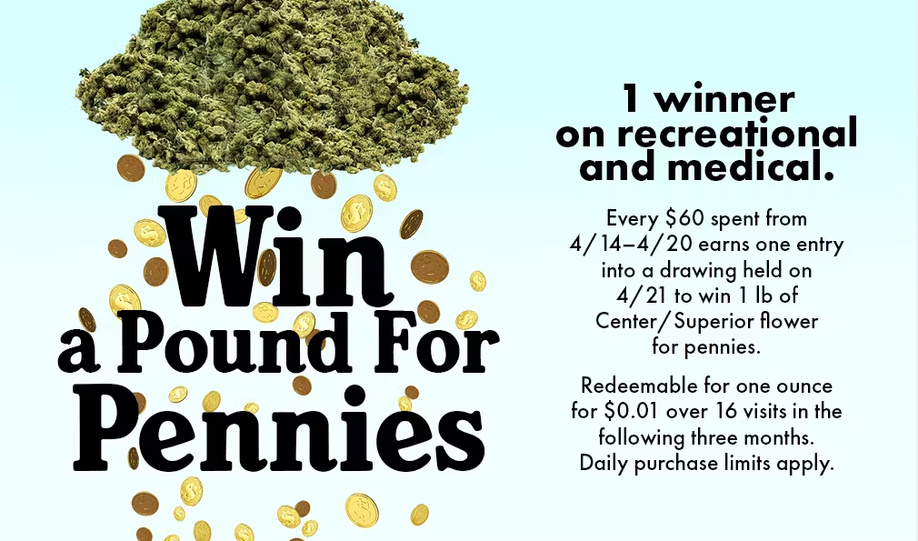 The Center, a dispensary located in an old firehouse on 600 South Broadway, has promised to essentially give away a full pound of weed to two lucky winners who shop at the store between April 14 and Sunday, April 20. According to a promotional flyer on the Center’s website, a drawing will be held on Monday, April 21, to pick one recreational customer and one registered medical patient as winners.