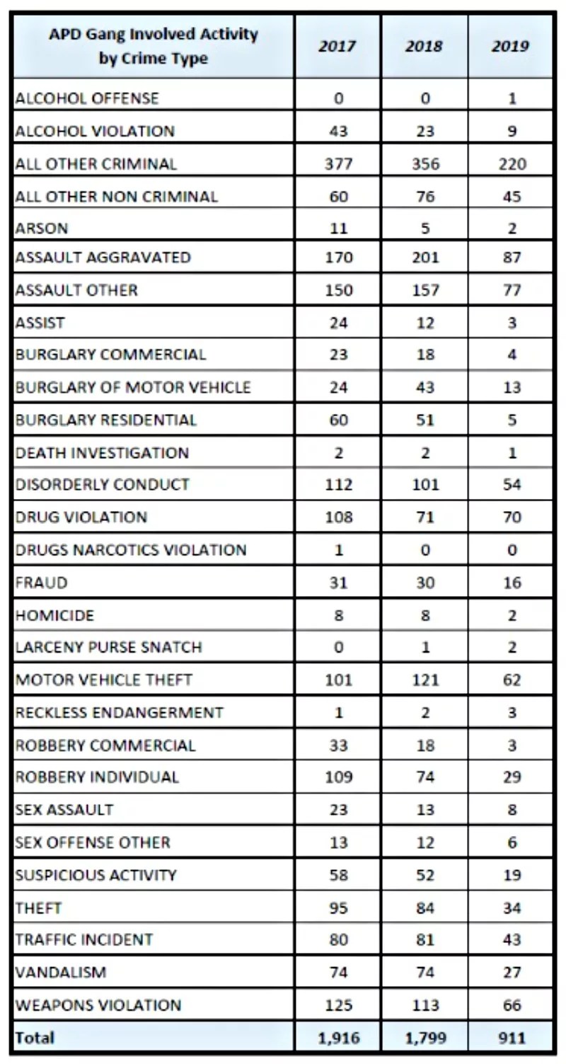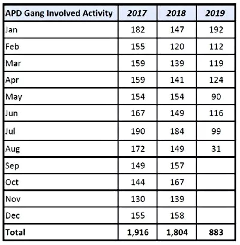 The Aurora Police gang unit keeps track of crimes suspected of having been committed by individuals with gang affiliations, and the numbers have been falling steadily over the past three years. Here’s a chart depicting the number of activities suspected gang-involvement incidents from 2017 through August 2019: