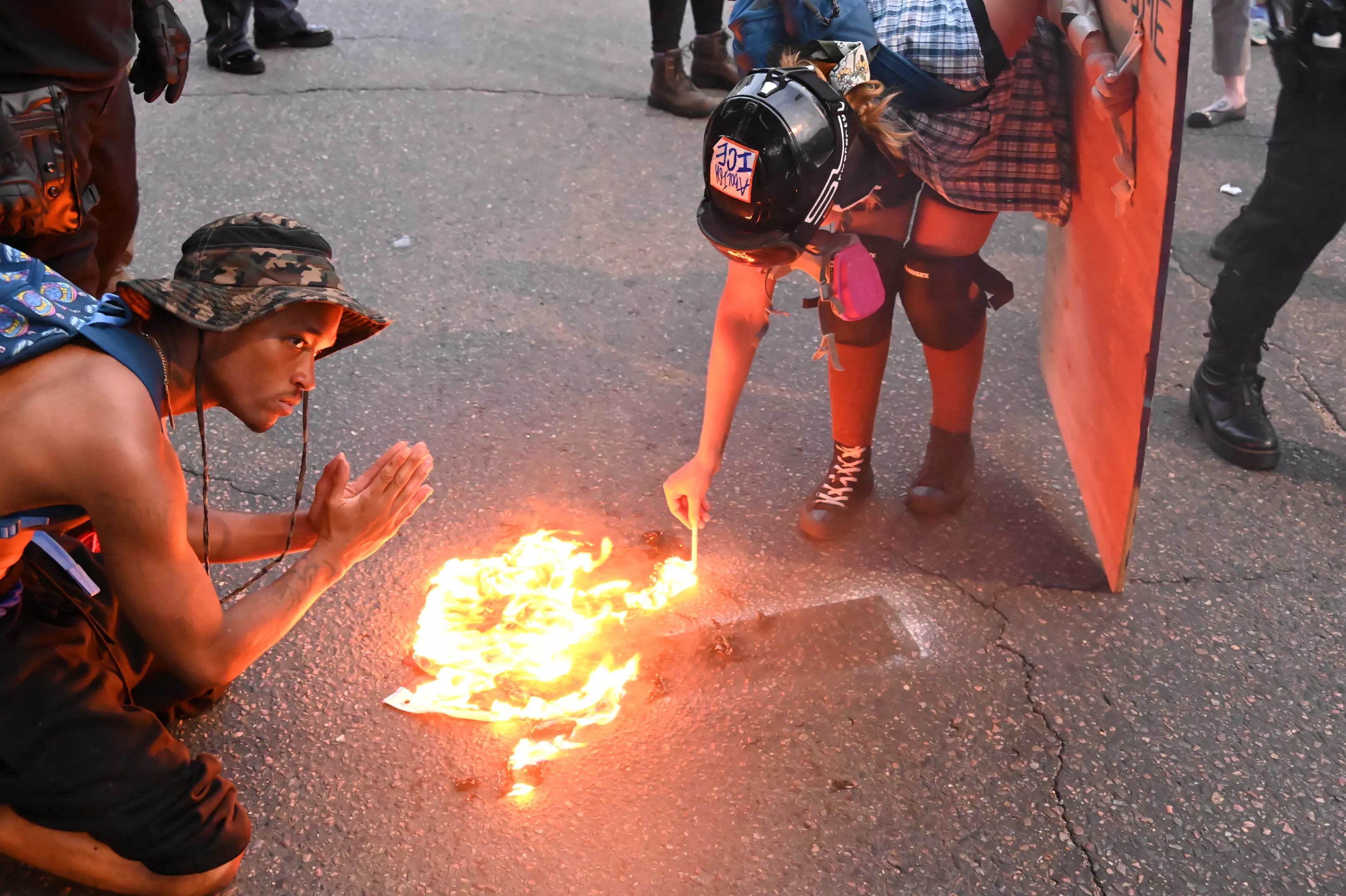 At the Good Trouble Lives On protest, about fifty people began marching down Lincoln Street at 7:30 p.m., circling back on Broadway and never going south of 11th Avenue. When they returned to the Capitol, they burned an American flag on Lincoln. After that, they and other protesters who’d hung around Lincoln Veterans Memorial Park called it a night.