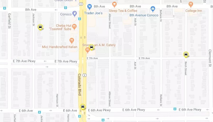 Nonetheless, the map reveals plenty of what O’Sullivan refers to as “hot spots,” including Colorado Boulevard, where hit-and-runs are ultra-common. As evidence, check out the following map excerpt from an area near Snooze and Trader Joe’s. The icons that look like cars over a yellow backdrop designate hit-and-run locations.