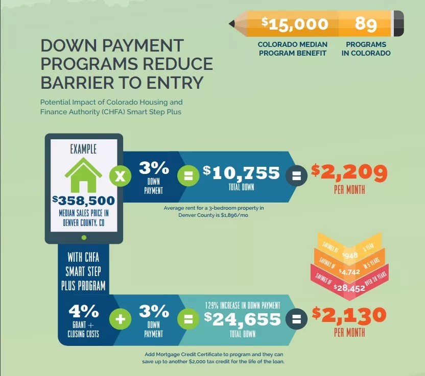 Down payment programs can actually help on both fronts: the down payment itself as well as the monthly house payment. Many down payment programs available for Denver buyers provide at least the minimum 3 percent down payment (and sometimes more) in the form of a grant, meaning the buyer doesn’t need to pay it back. That helps the prospective buyer get over the hump of saving for the down payment. Additionally, this type of grant in tandem with the borrower’s own savings can help that borrower put down more than the minimum 3 percent, which in turn will help lower the monthly house payment.