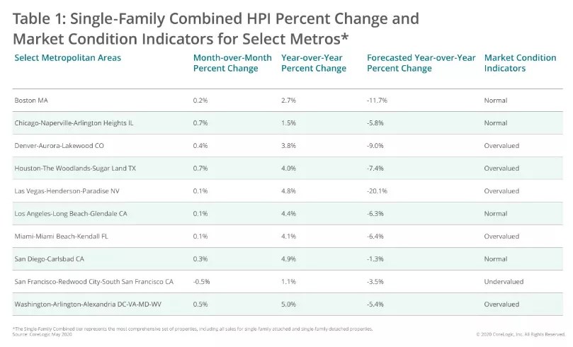Here’s the CoreLogic graphic that compares the HPI percentage change forecast for ten major metropolitan areas across the country, including Denver, through May 2021: