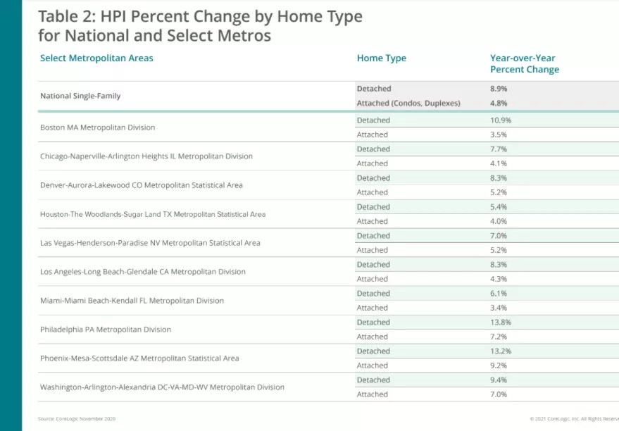 “The CoreLogic HPI for the U.S. rose 8.2 percent in the twelve months ending November 2020, compared with a rise of 7.6 percent for the Denver metropolitan area during the same period,” Nothaft notes. “Thus, Denver was similar to the national trend over the past year.”