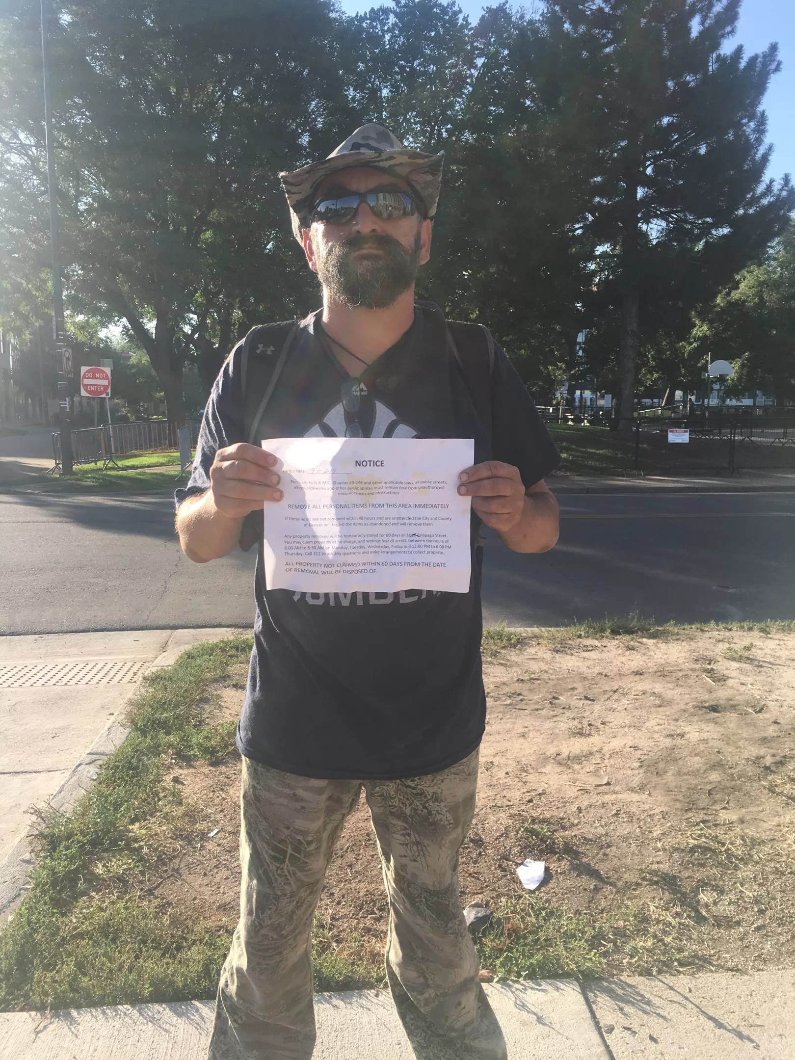 Wolf, who has been living in the encampment on 24th and California, holds a notice he received saying that the city will seize property unless it is moved within 48 hours.