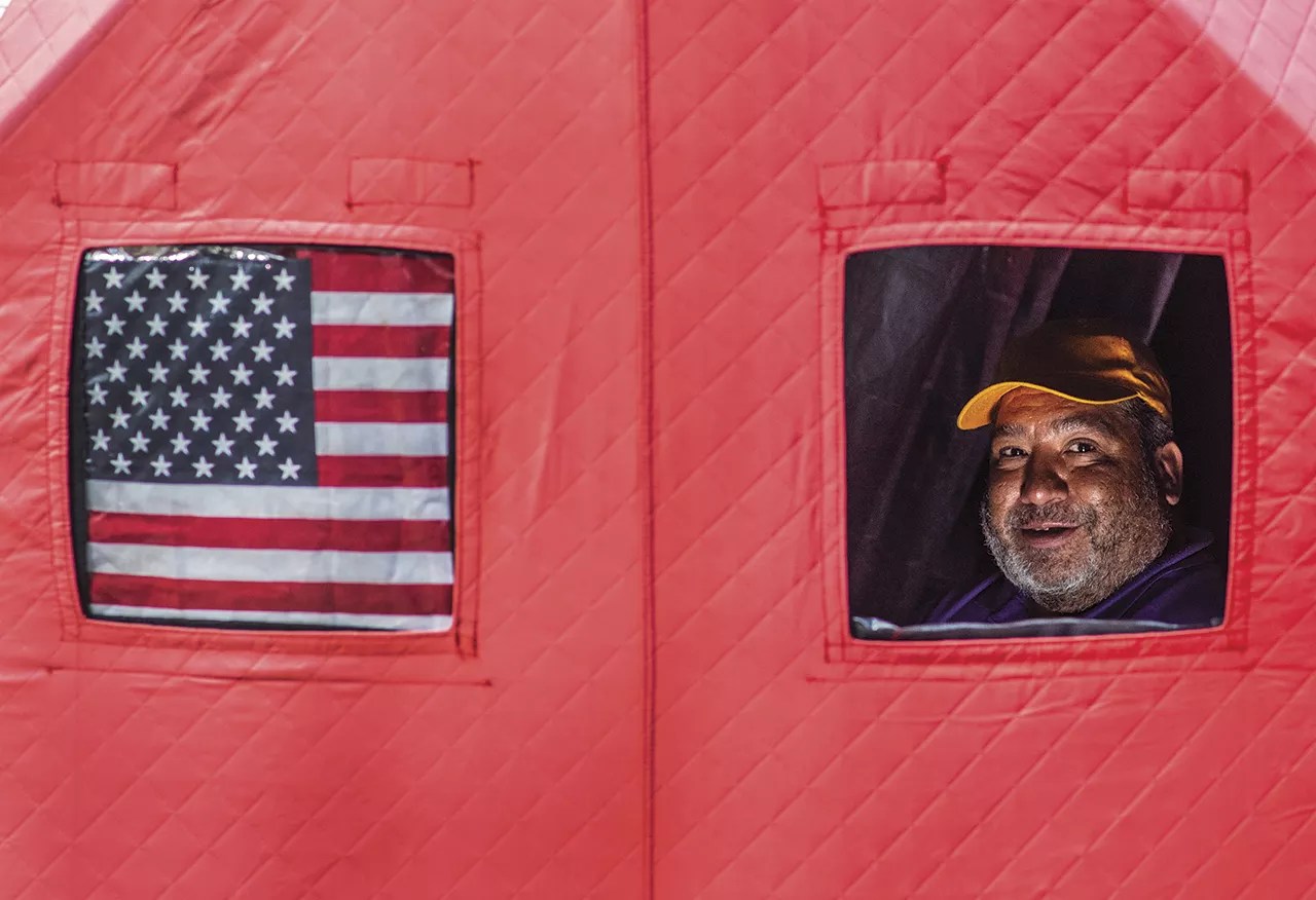 Montes lives just a handful of blocks from the mall, in an ice-fishing tent in the parking lot of the Denver Community Church at East 16th Avenue and Pearl Street. He and approximately thirty other individuals currently call that lot home; it’s one of the two safe-camping sites that debuted in Denver last December.