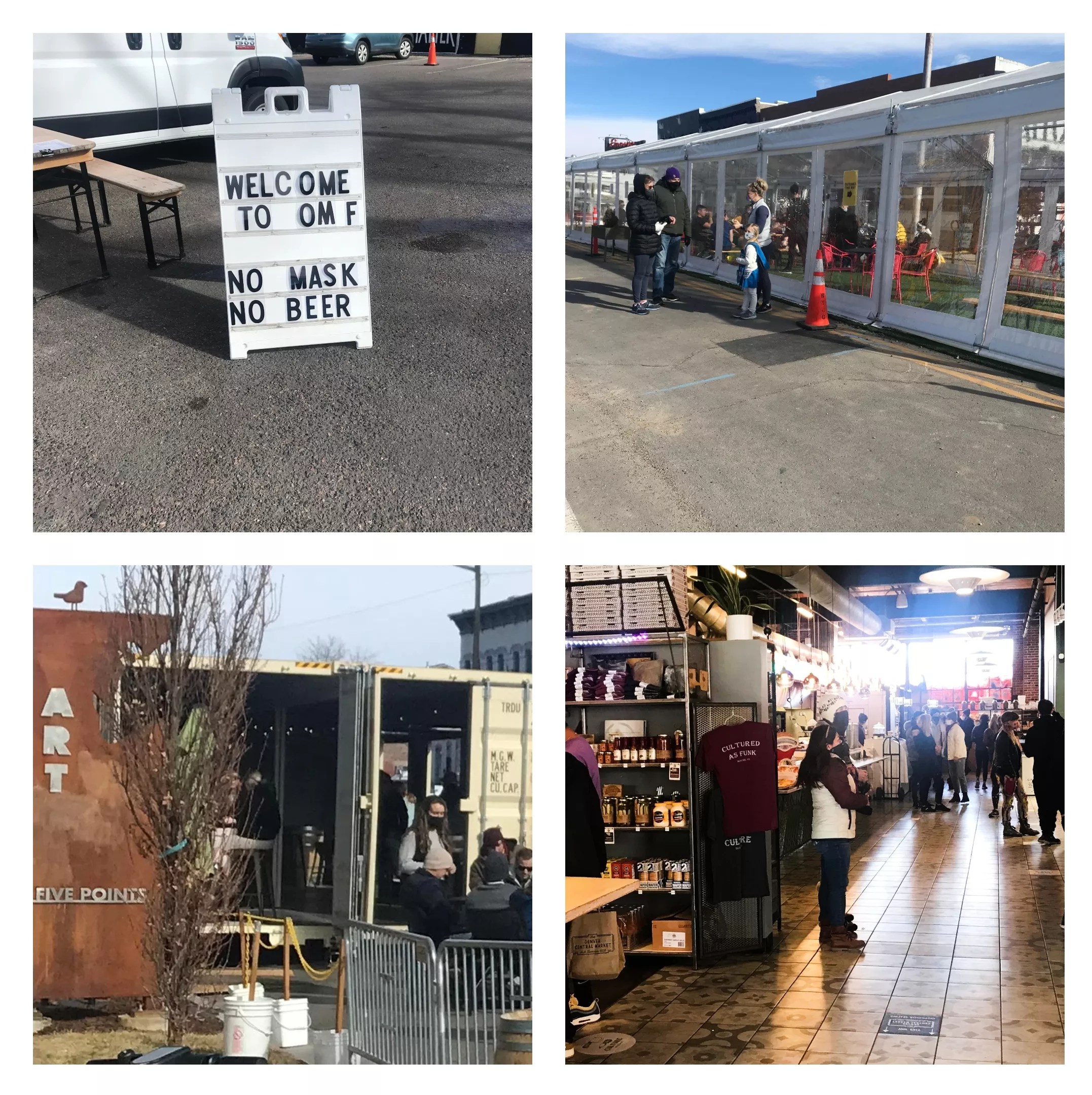 Clockwise from upper left: A sign of the times in RiNo on February 6; the tented dining area in Ratio; inside the Denver Central Market; outdoor dining on a beautiful but brisk day.