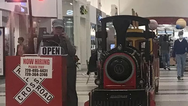 An unmasked kiddie-train engineer at Colorado Mills on December 3.