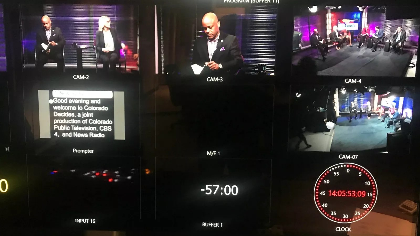 After a quick consultation with McDonald after the interview, Giellis hurried to the Colorado Public Television studio, where her interlocutors – CBS4 political reporter Shaun Boyd, consultant Eric Sondermann and CPT host Dominic Dezzutti – were assembling. Shortly thereafter, Hancock strolled in and took a seat alongside Giellis. But despite their close proximity, they didn’t give off the air of friendly combatants.