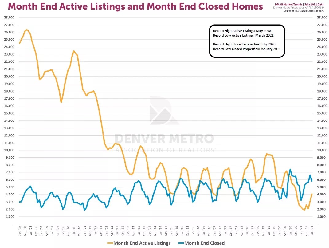 A graphic from the DMAR report, which runs from the start of 2008 to July 2021, puts these factors in historic perspective. The yellow line corresponds to active listings at the end of each month, while the blue line shows sales that closed over the same periods: