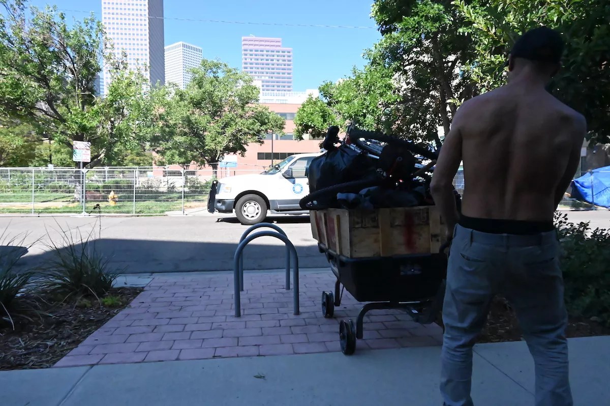A homeless Denver resident who asked only to go by Dustin pulls a wagon full of his stuff onto the sidewalk as Denver Police begin forcing people to leave the encampment at 18th Avenue and Logan Street.