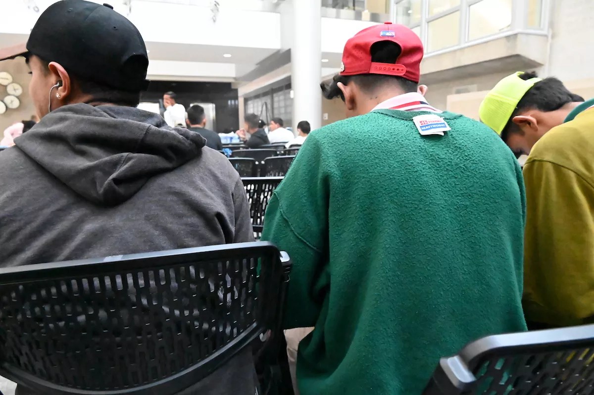 Miguel Alvares and two friends to his left sit in Denver’s new migrant intake center and wait for their tickets to a second location to print.
