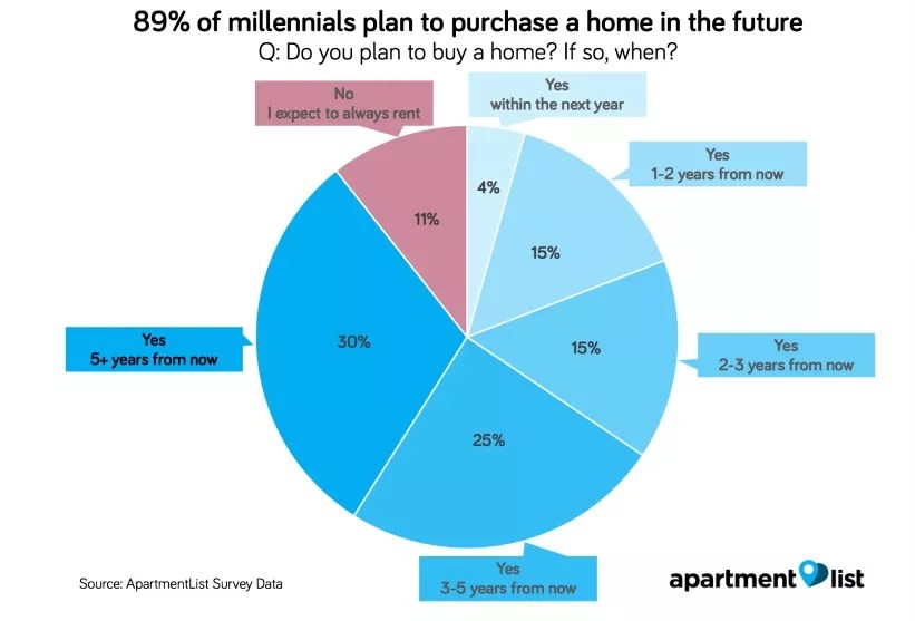 According to data gathered by Warnock and fellow author Chris Salviati and illustrated in graphics seen here, nine out of ten millennial renters want to buy a home of their own, but just 4.9 percent think it’s possible to do so within the next year. That’s because 72 percent of millennial renters with home-buying on their mind are putting off a purchase because they simply can’t afford it – and 62 percent pinpoint an inability to come up with enough folding green for a down payment as the reason.