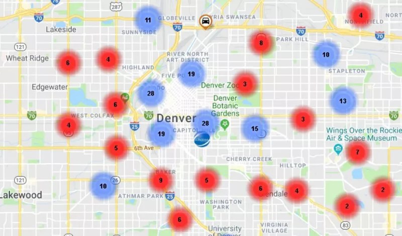 The map’s collection of accident reports from September reveals numerous clusters of accidents and hit-and-runs, the majority of which are unattended – e.g., a car smashing into an unoccupied vehicle or the like before rabbiting. Single-digit groupings are depicted in red, while those with more appear in blue. As you can see from the following screen capture, the issue is greatest in nine areas arrayed in and around central Denver, as well as four other outlying spots not pictured here: Montbello and College View (10), Virginia Village/University Hills (11) and near the University of Denver campus (13).