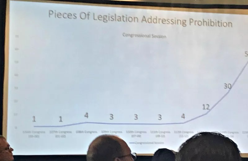 Denver NORML’s presentation included this slide showing the sharp increase in the number of marijuana measures introduced in Congress during recent years.