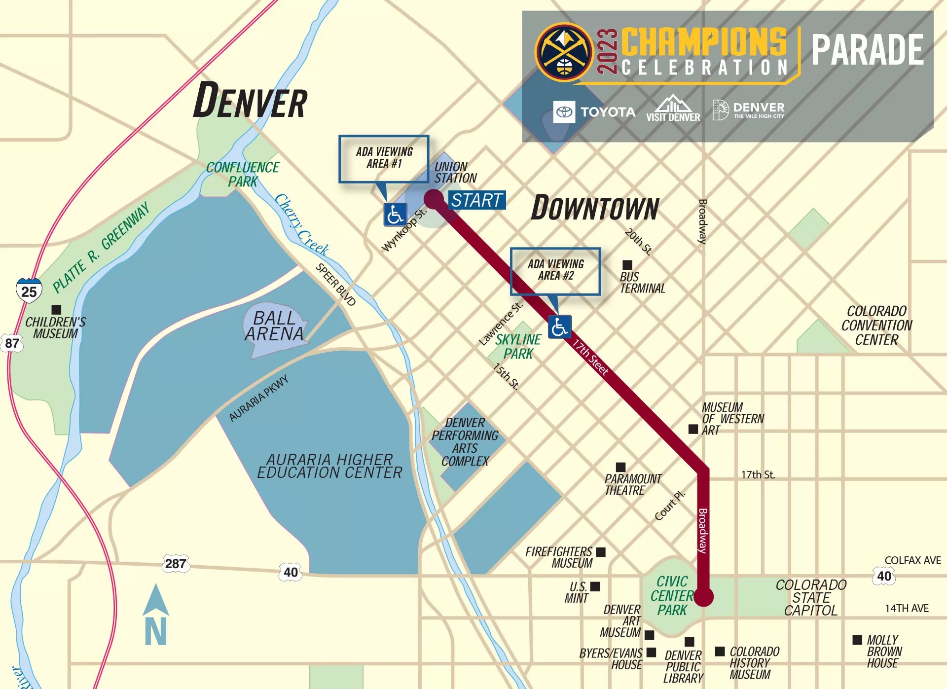 The Denver Nuggets Champions Parade will leave from Union Station, travel along 17th Street to Broadway, then turn south to Civic Center Park for a rally with Denver Nuggets players, coaches and management, including owners Stan Kroenke and Josh Kroenke; Denver Mayor Michael B. Hancock and other civic leaders; the Denver Nuggets Dancers and PA announcer Kyle Speller; and OG mascot Rocky.