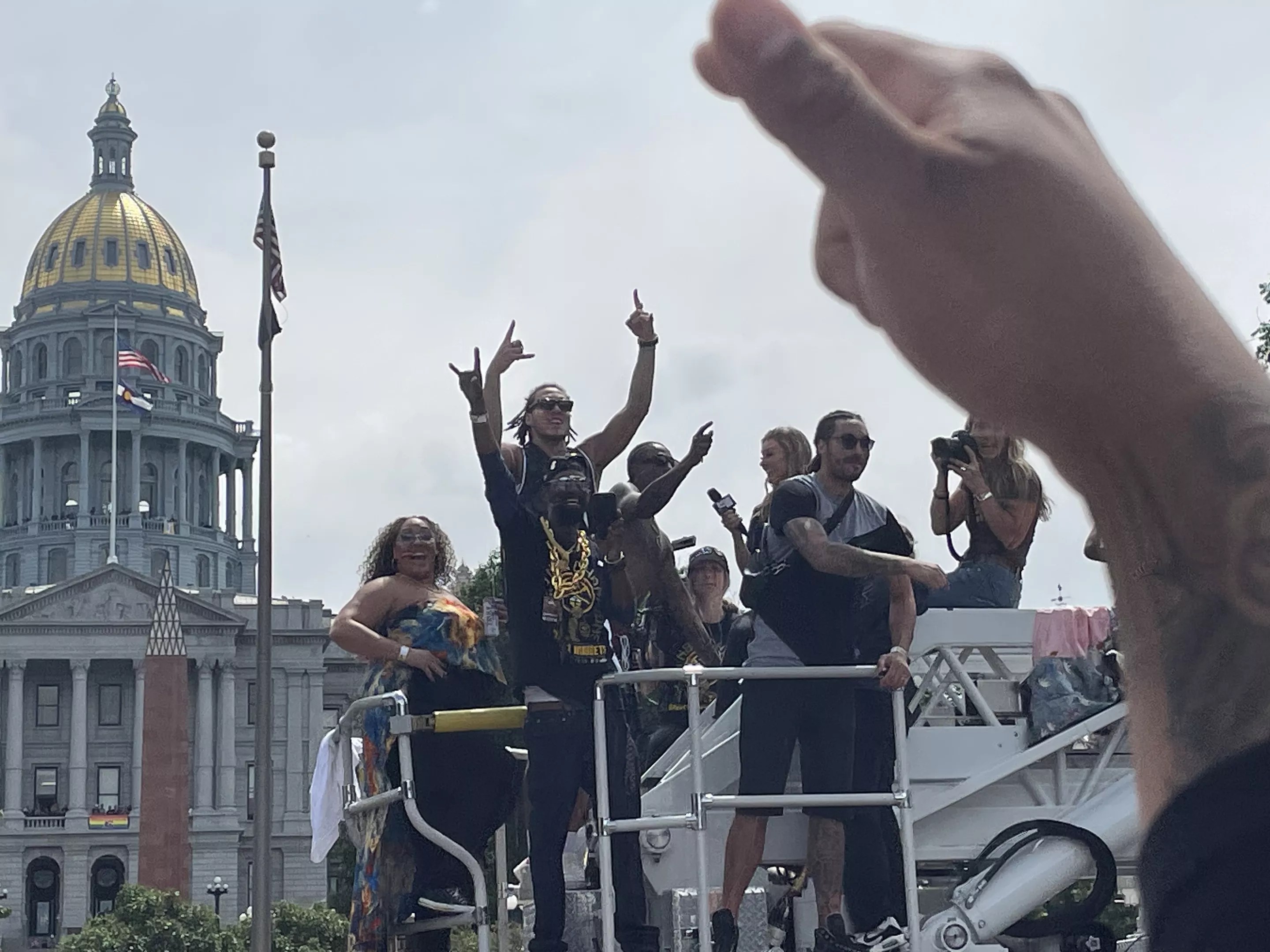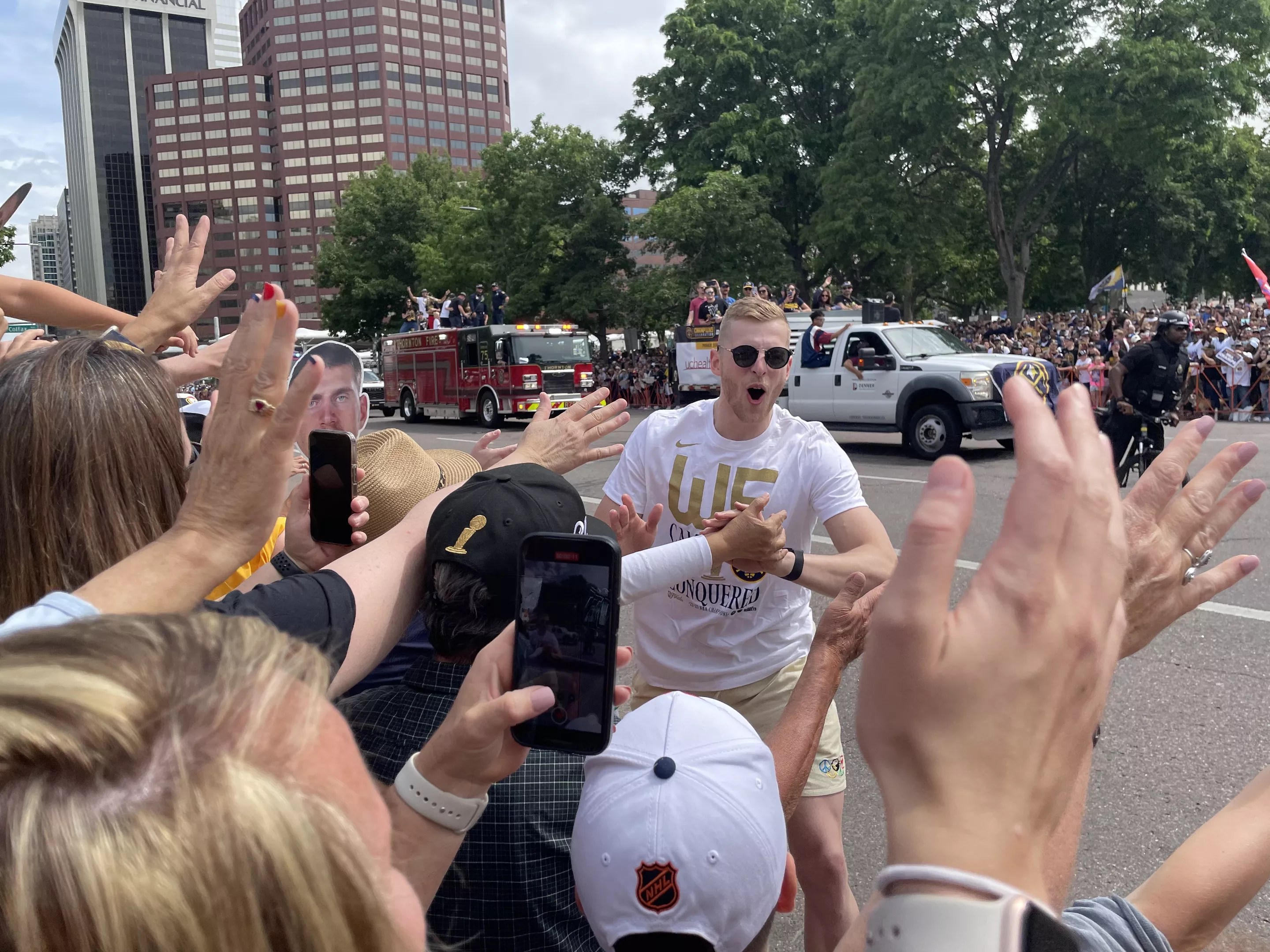 Members of the Nuggets team traveled together on fire trucks from Union Station to Civic Center. The most memorable truck was the one carrying Braun and fellow rookies Jack White and Peyton Watson. Braun wore a makeshift wrestling belt, and Watson and White hyped up both the crowd and their colleague.