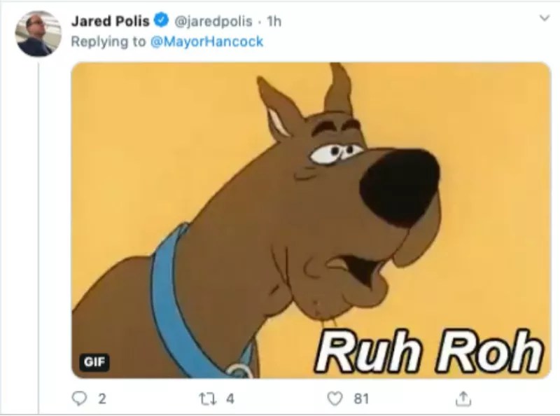 Rather than sending animal control to Polis’s residence to hand him a citation and seize the puppy (thousands of pit bulls have been euthanized since the ban began), Hancock responded with a single word, “Wow!!,” which appears to have been his attempt to seem good-humored despite this shot across his bow-wow. But Polis wasn’t done. He replied to Hancock with a graphic of Scooby-Doo, the famed cartoon Great Dane, delivering a trademark expression of concern: “Ruh Roh.”