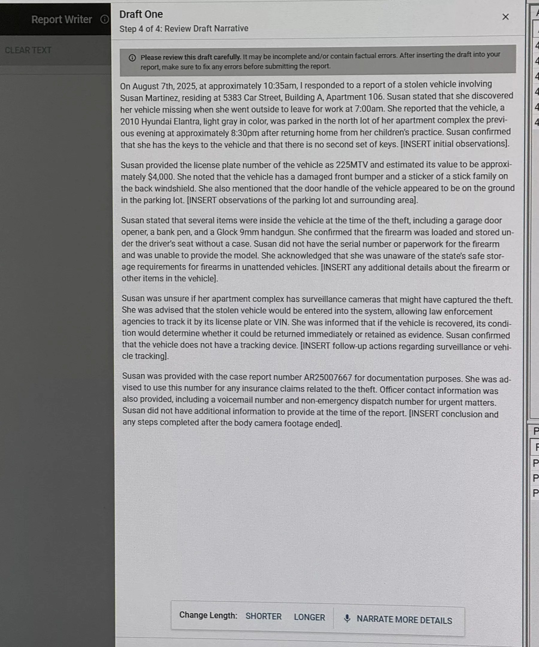 Draft One’s initial draft of a police report for a staged demonstration of the technology.