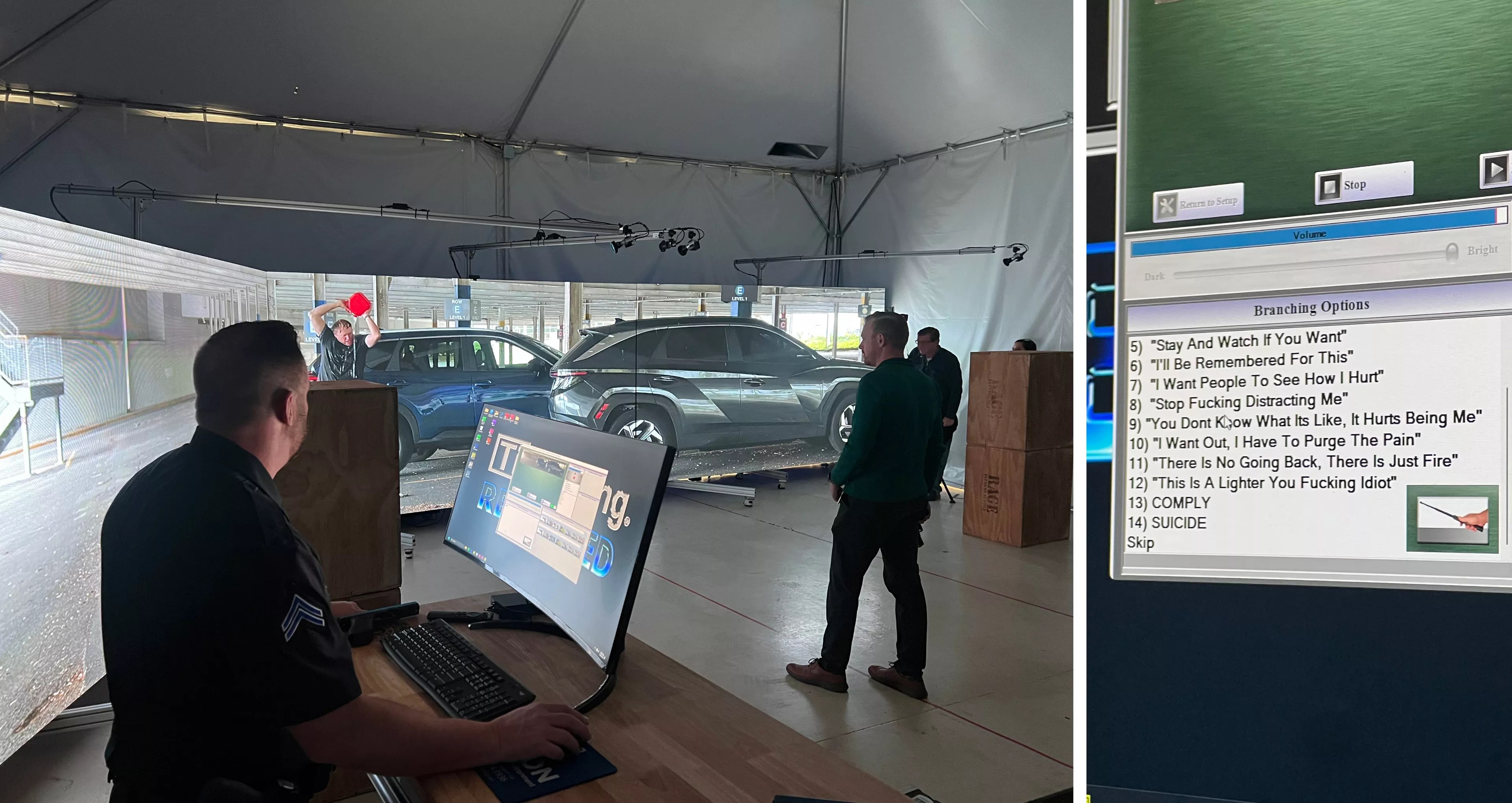 The simulator depicts a suicidal man pouring gasoline on his head, threatening to set himself on fire (left). The man’s words and actions are chosen by Corporal Jason Moore (right).