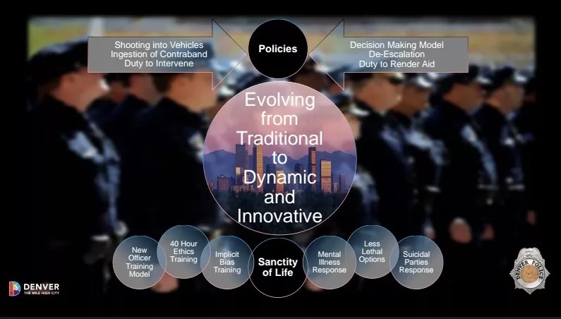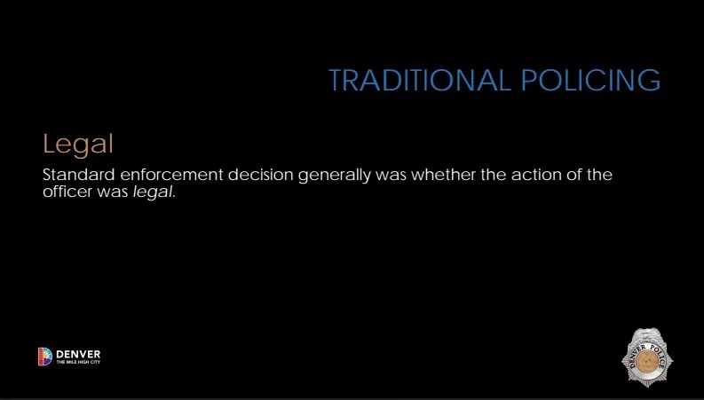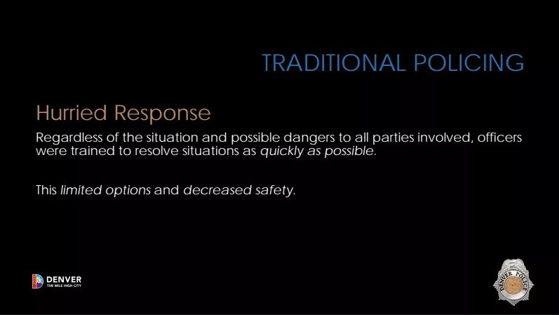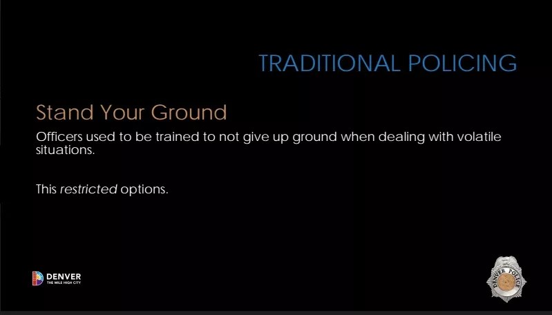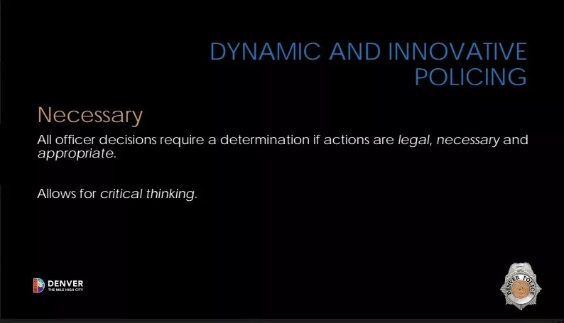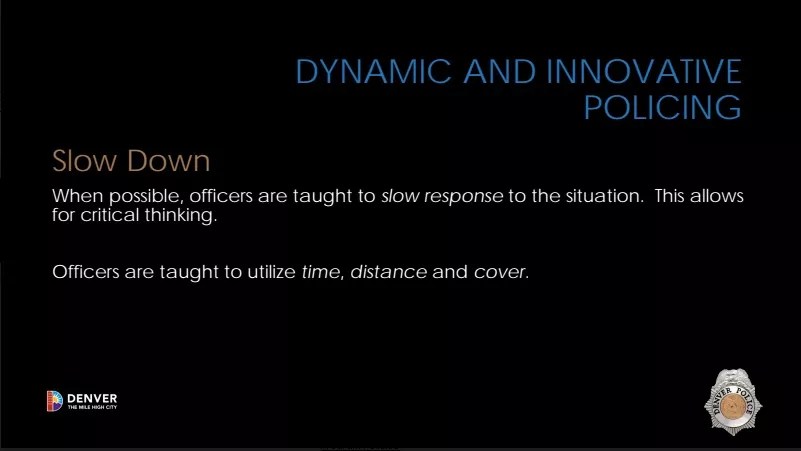 The best way to help people understand that is the chase policy. It is legal in Colorado to chase someone with a car who’s committed a crime. But it’s against Denver policy unless there are very specific situations that are occurring in that case. So Denver has chosen – and the metro chiefs have chosen – to make policy more restrictive than the law. That’s what this does when it comes to the use of force. So that’s really important. We’re asking officers to not do what the law allows, but do what’s really necessary. And to do that, you have to have critical thinking, which is why we introduced the decision-making model. The idea is to get officers thinking about these things – and if they slow down, we believe they’ll make better decisions.