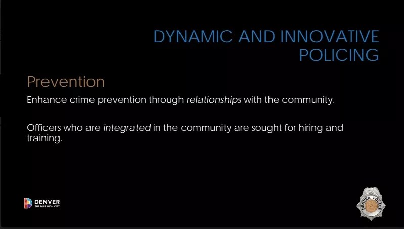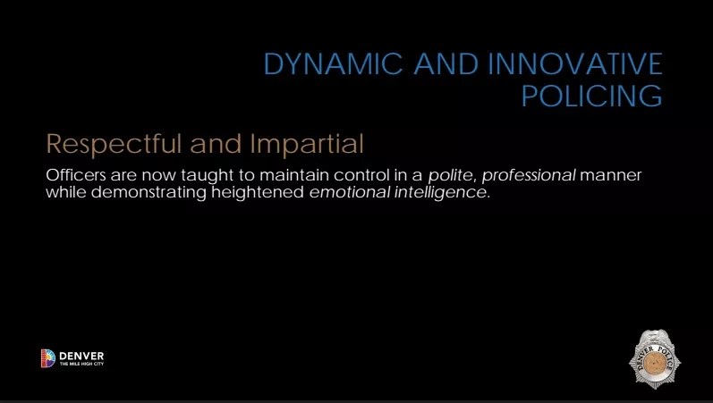 We also have – and it’s going to start at the end of this month, on the 30th – a forty-hour mandatory ethics course that includes one day of community service for every single employee of the Denver Police Department. It’s going to take about three years to complete that. The concept is that as they’re going through this decision-making model that’s centered around ethics, and with that training, people will generally make the right decisions rather than just reacting to a situation they’re faced with.