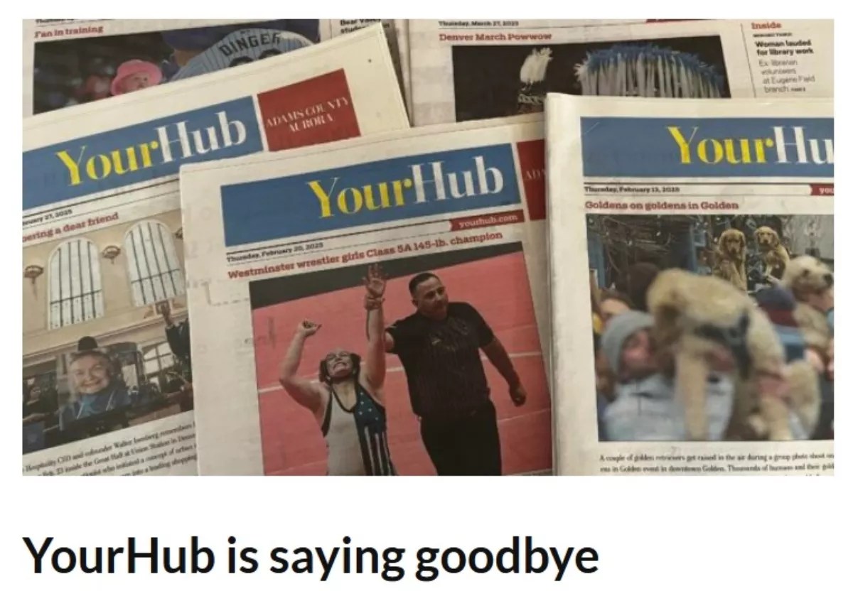 YourHub has died at the tender age of twenty and will be buried soon. The community journalism project’s final offering was published in the Denver Post on May 29 and its content will vanish from YourHub’s online home at the end of June.