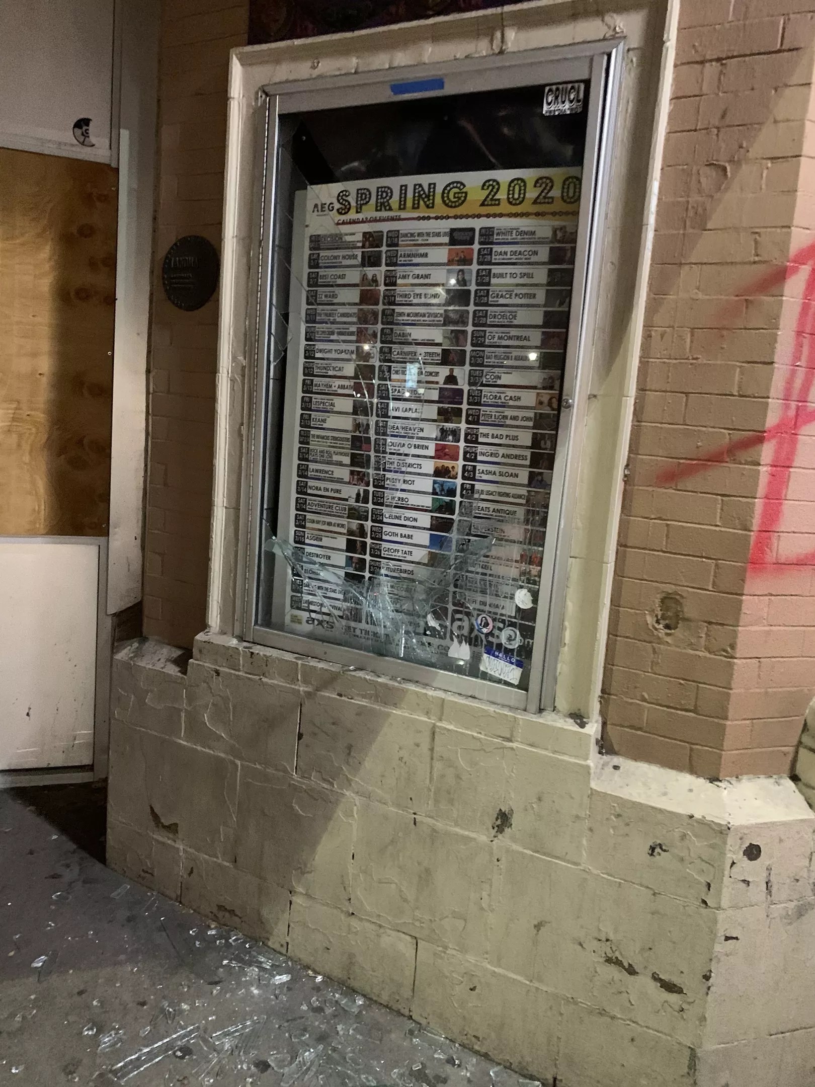 Most of the broken windows that protesters left in their wake were at banks and other financial institutions along East Colfax Avenue. However, they also smashed the display windows of the historic Ogden Theatre, which were still showing the Spring 2020 concert schedule. And they broke the windows of a small dentist’s office.