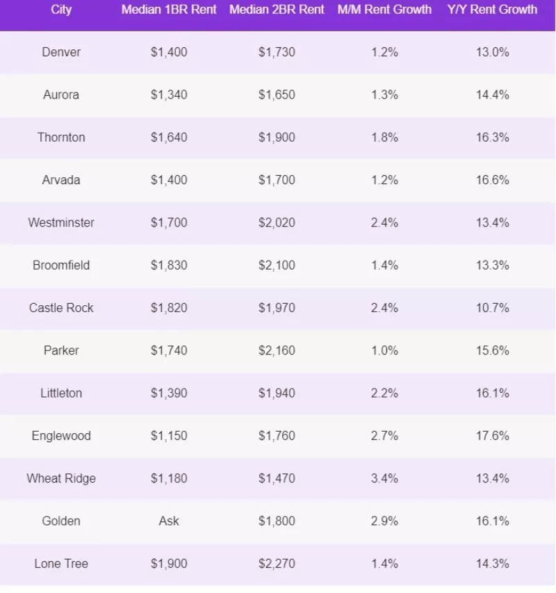 In May, median rents for two-bedroom units landed at $1,730 in Denver, compared to $1,760 for Englewood, $1,800 for Golden, $1,900 for Thornton, $1,940 for Littleton, $1,970 for Castle Rock, $2,020 for Westminster, $2,100 for Broomfield, $2,160 for Parker and $2,270 for Lone Tree.