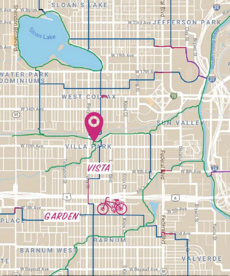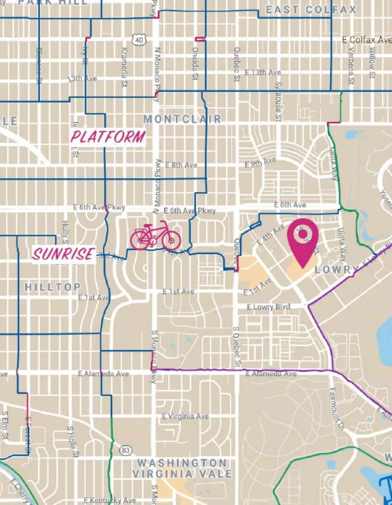 Alternative byways like these can be found all over Denver, Stopper says. When the first version of the map was put online in June 2018, “I think there were about 200 or so miles of trails and kind of quiet neighborhood streets. But it’s grown in the ensuing year or so to about 400 miles of trails and neighborhood streets. We also ran a Kickstarter campaign in March to print and give away 20,000 copies of the map. We got those back in early July and mid-August, and it took about six or seven weeks to give them all away. One thing that’s been super-awesome is how much the local business community appreciates that more people on bikes is a positive. We have a secondary map on our site that lists all the places where you could get a physical copy, and we’re in the process now of working on a second printed version – so we’ll hopefully resupply those locations soon. A mobile app is in the works, too. We’re trying to do everything we can to make it as easy to follow the routes as possible.”