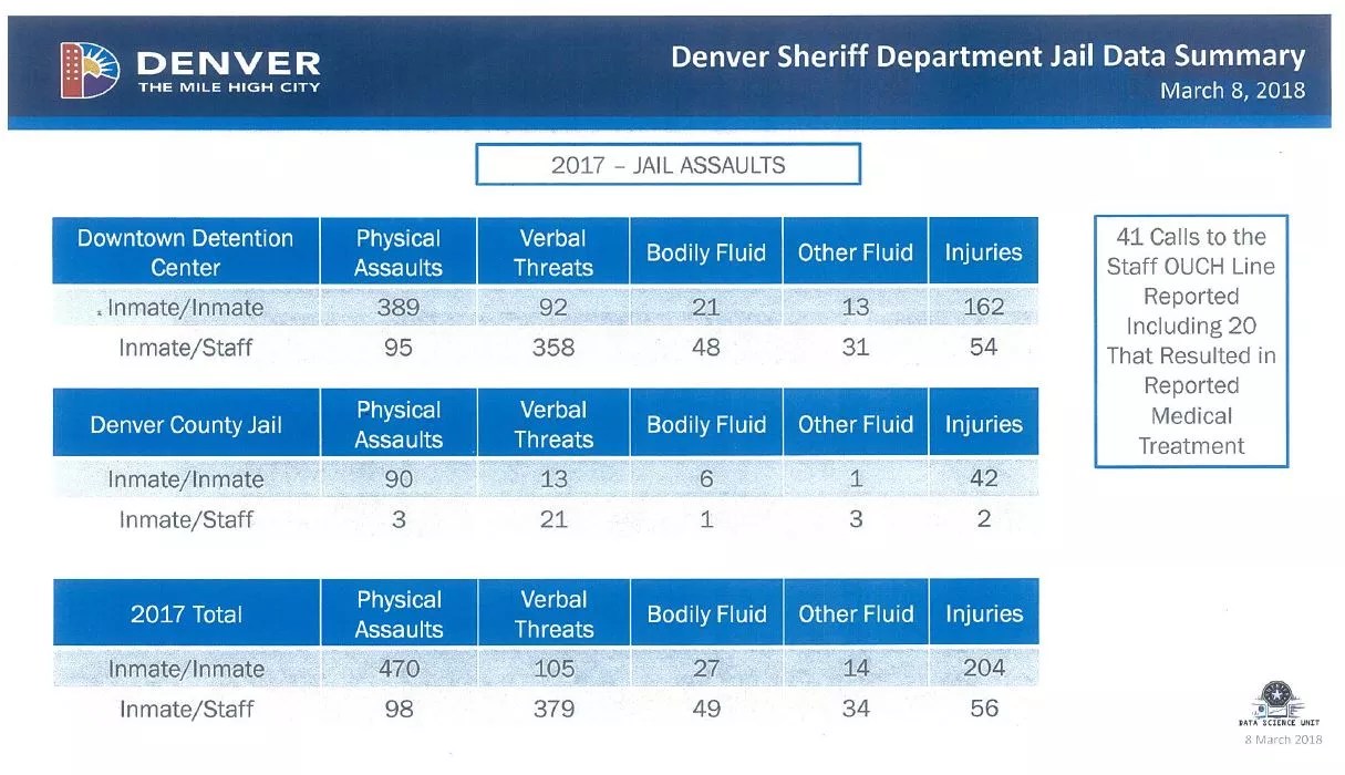 The most interesting revelation from Firman’s discussion of reforms was new data compiled by the department that breaks down the numbers and types of assaults occurring in Denver jails. Firman said that the department had not been keeping data that differentiated types of assaults, and a team known as the Data Science Unit had to read hundreds of incident reports to compile the numbers.